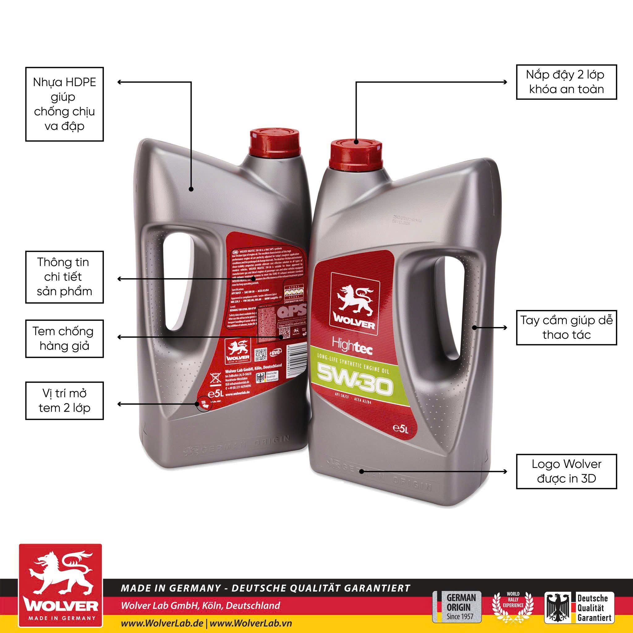 Nhờ công nghệ phụ gia độc quyền được nghiên cứu từ Đức, sản phẩm đảm bảo độ sạch cho buồng đốt và hệ thống bôi trơn, giữ vai trò quan trọng trong việc tăng tuổi thọ động cơ. Nhiều dòng xe châu Âu tại Việt Nam, đặc biệt là xe Đức và xe Pháp, yêu cầu loại dầu đạt tiêu chuẩn API và ACEA nghiêm ngặt. Wolver HighTec 5W30 đáp ứng đầy đủ các tiêu chí này.