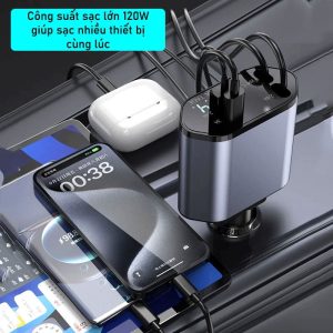 Tẩu Sạc Nhanh Ô Tô C1 120W Tích Hợp Cáp Sạc Rút Gọn, Hỗ Trợ Sạc Nhanh Mọi Thiết Bị