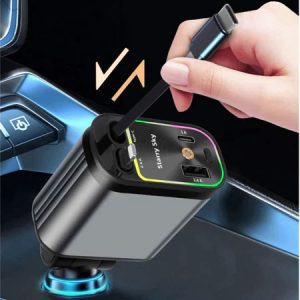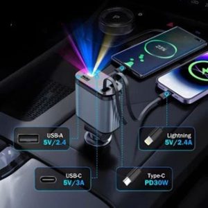 Tẩu Sạc Ô Tô 4 in 1 Có Đèn Led Chiếu Trần – Sạc Nhanh 120W, Dây Rút Tự Động 4 Cổng USB Type-C Và Lightning